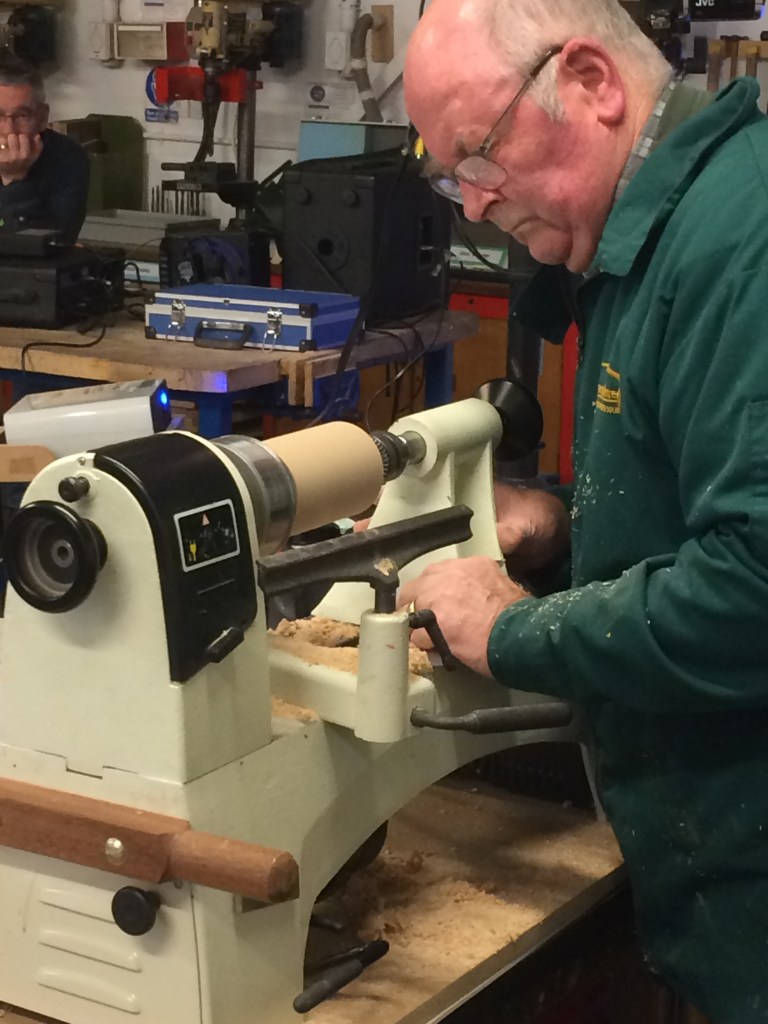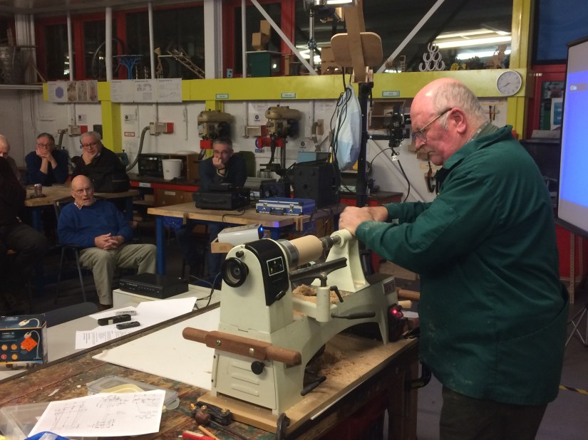 Tonight Roy demonstrated how to turn a cocktail stick holder in beech – one of the many items that he regularly sells at local craft fairs.