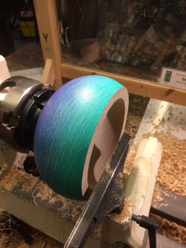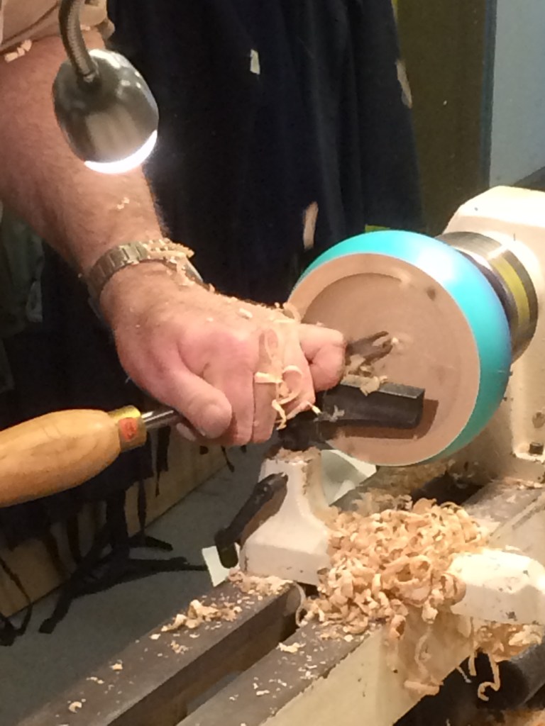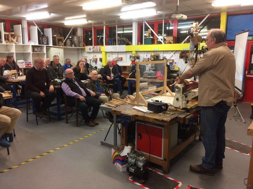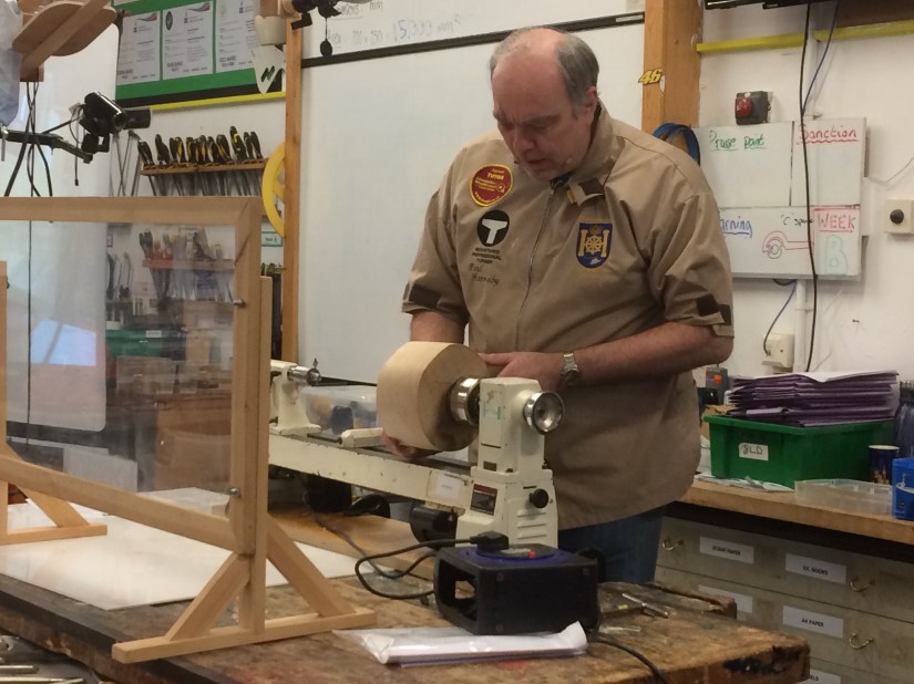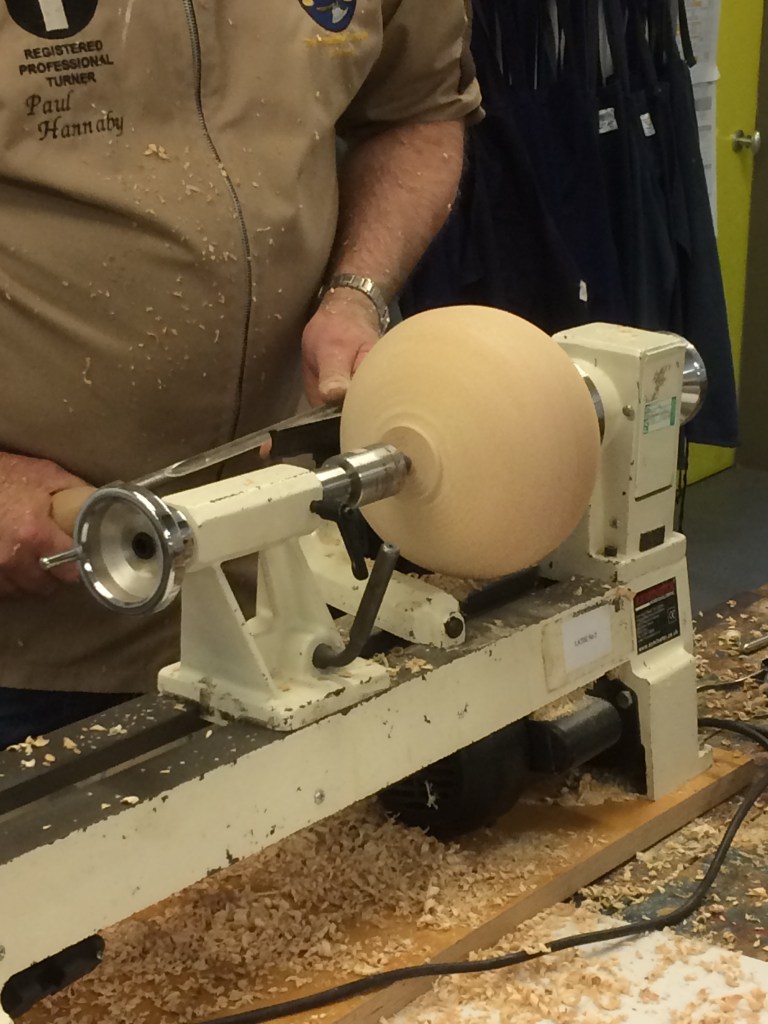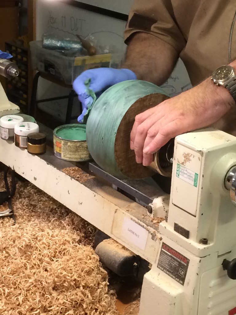 A packed house welcomed the out – going chairman of the AWGB Paul Hannaby to our club. He set out to demonstrate to the members correct bowl -turning techniques followed by his signature methods of colouring those bowls. He began by turning the outside of the bowl using a spindle gouge (and explained his choice of tools and techniques for avoiding tear – out and achieving a professional finish as he went along).