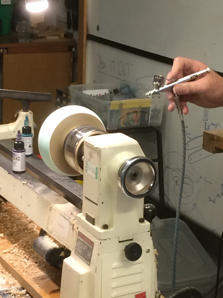 With the outside completed he then showed us various methods of applying gesso to the surface as a base for spraying with acrylic colours. He demonstrated his knowledge of techniques and equipment which he has built up over 20 years of experimentation with the medium and then turned away the middle taking care to show us of his methods of achieving a smooth final result.