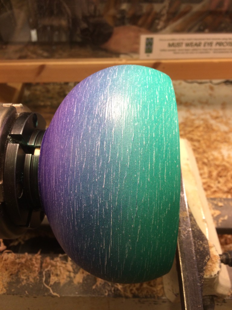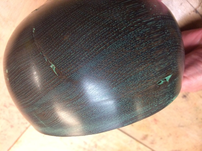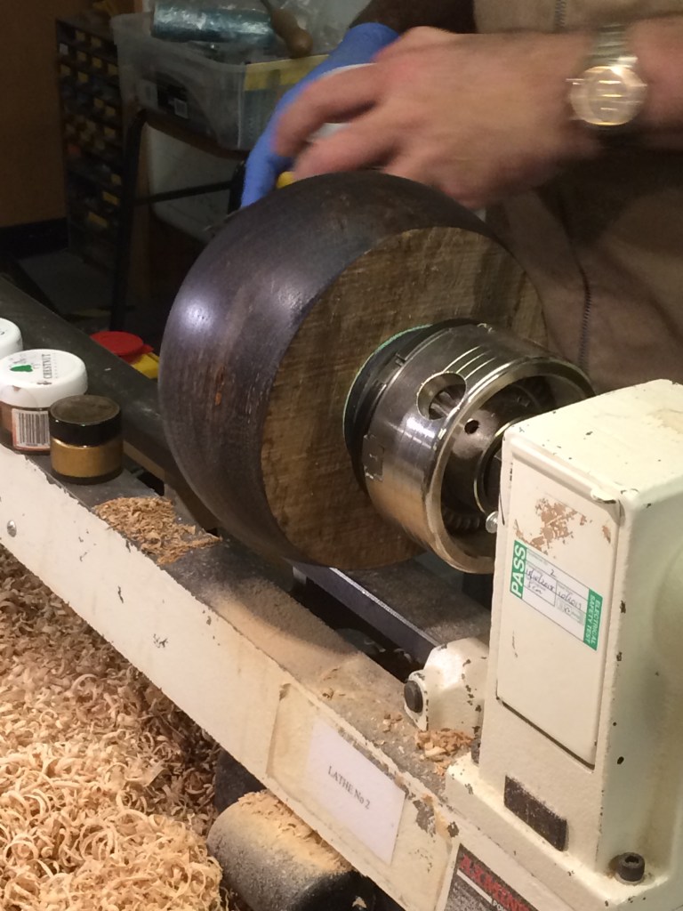 With the remaining time he turned the outside of a piece of oak and then use a vinegar/steel wool solution to darken the wood prior to applying a paste on top. When the excess was removed using paper towel a very attractive finish remained.