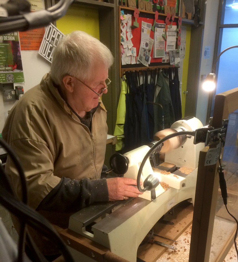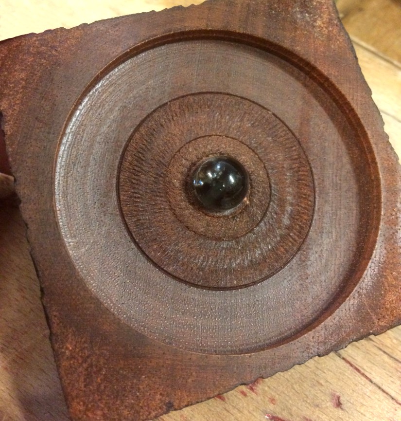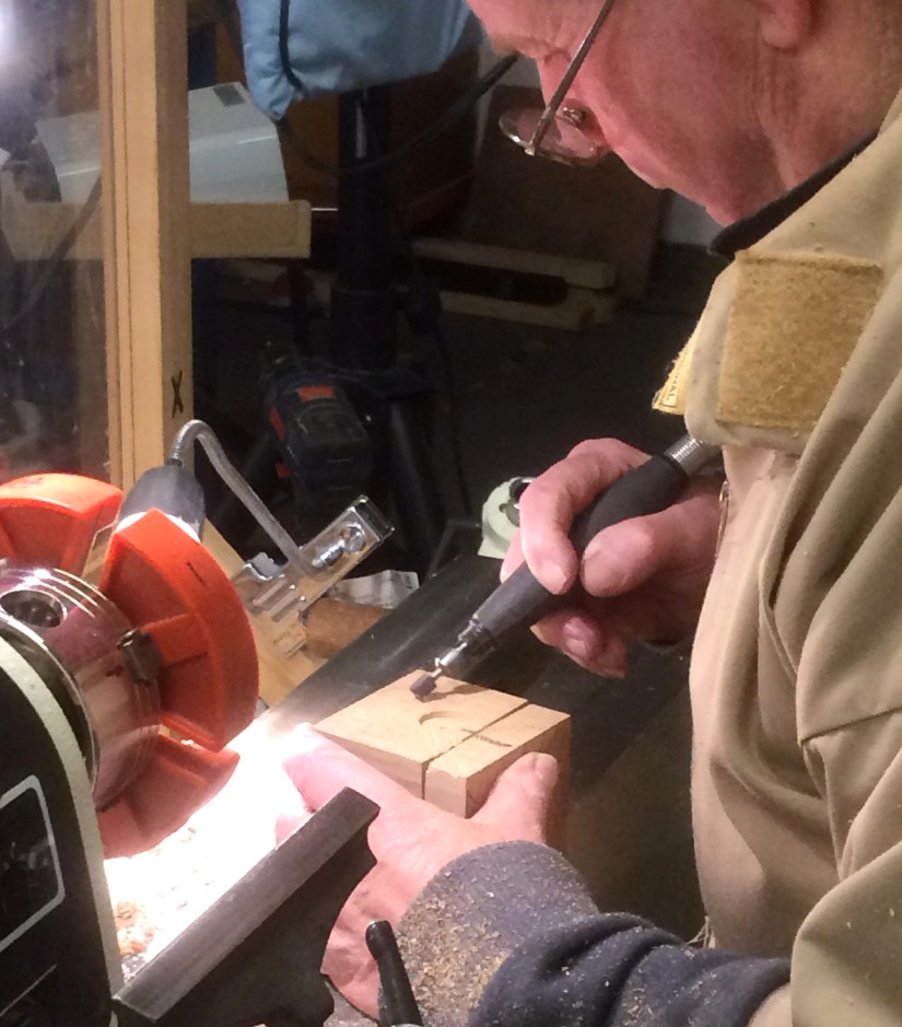 After the break he then showed us all his custom made chuck for holding this square piece while he used a texturing tool on the inside of the lid. He then assembled the box and drllled 2 – 3mm holes in the sides ready to accept an insert but unfortunately Geoff had left these in a box at home (along with his marbles and superglue!)