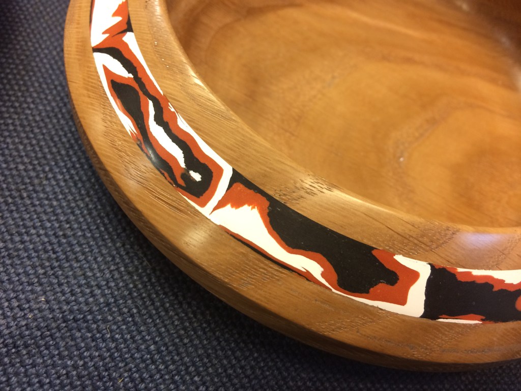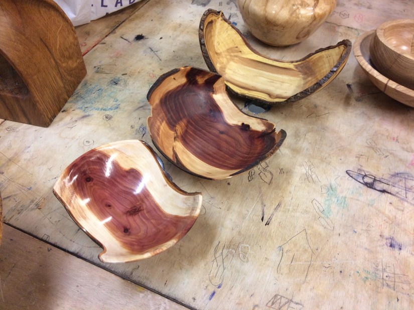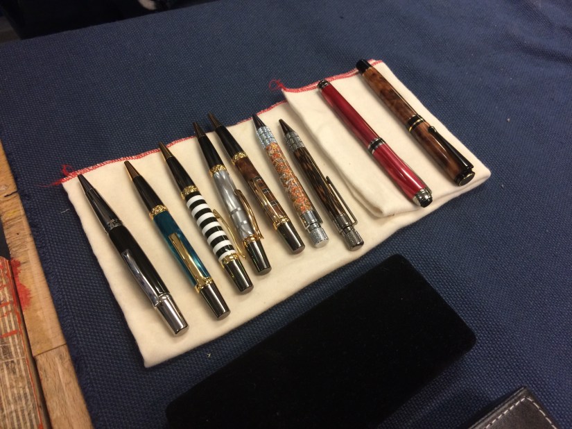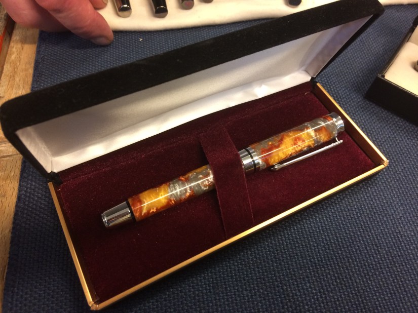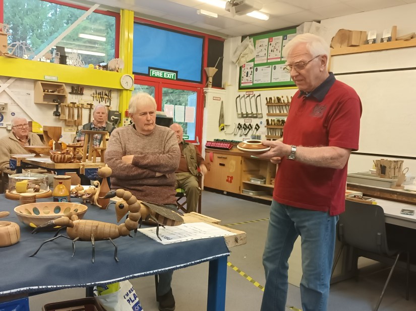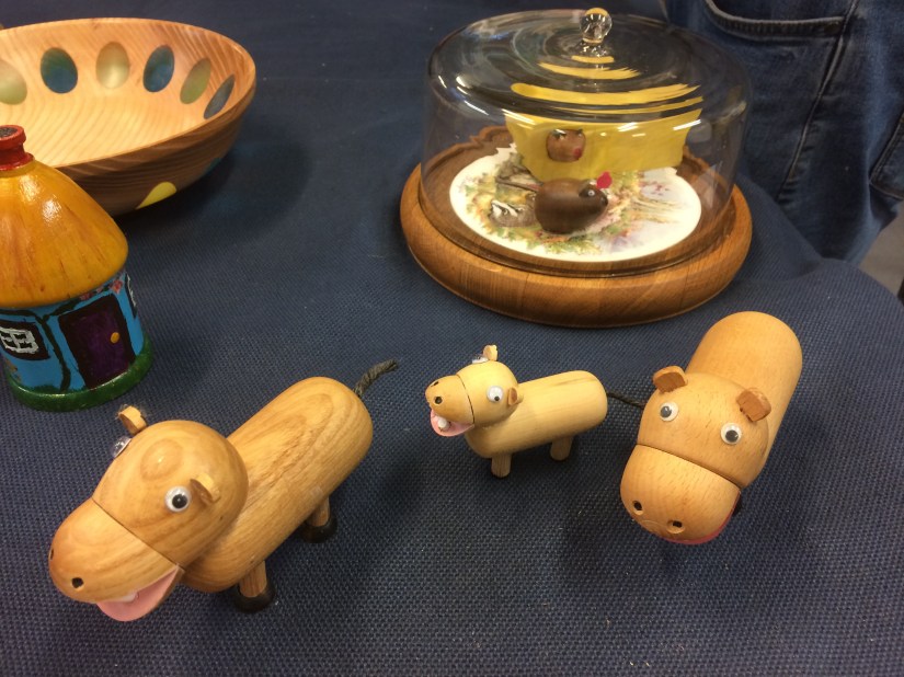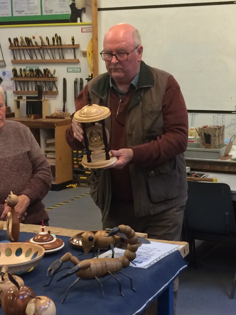 Other items from the night included Keith’s ash bowl with coloured resin inserts, Roy’s clock, a selection of pens made by Robert and Geoff’s animals.
