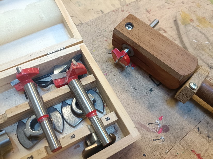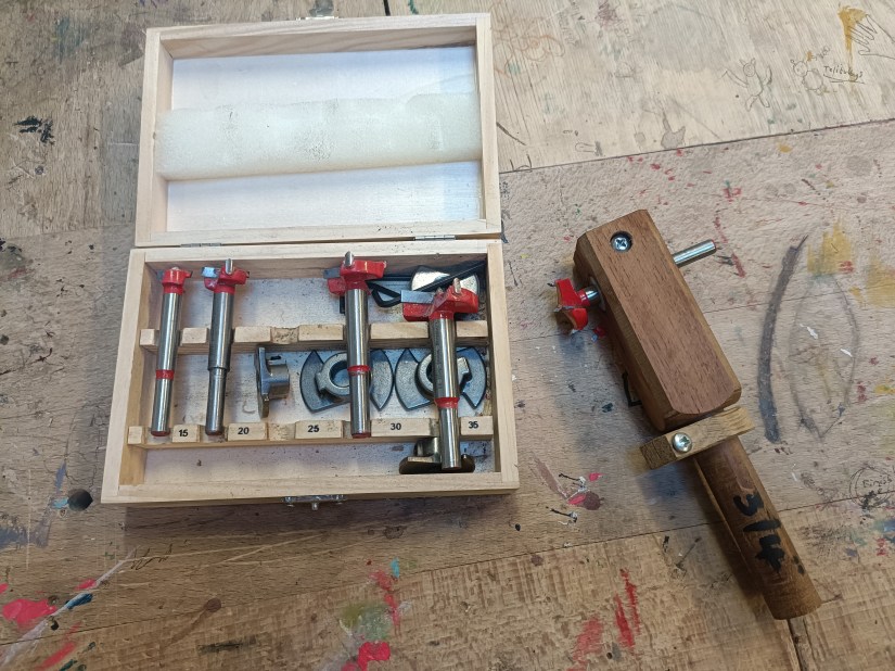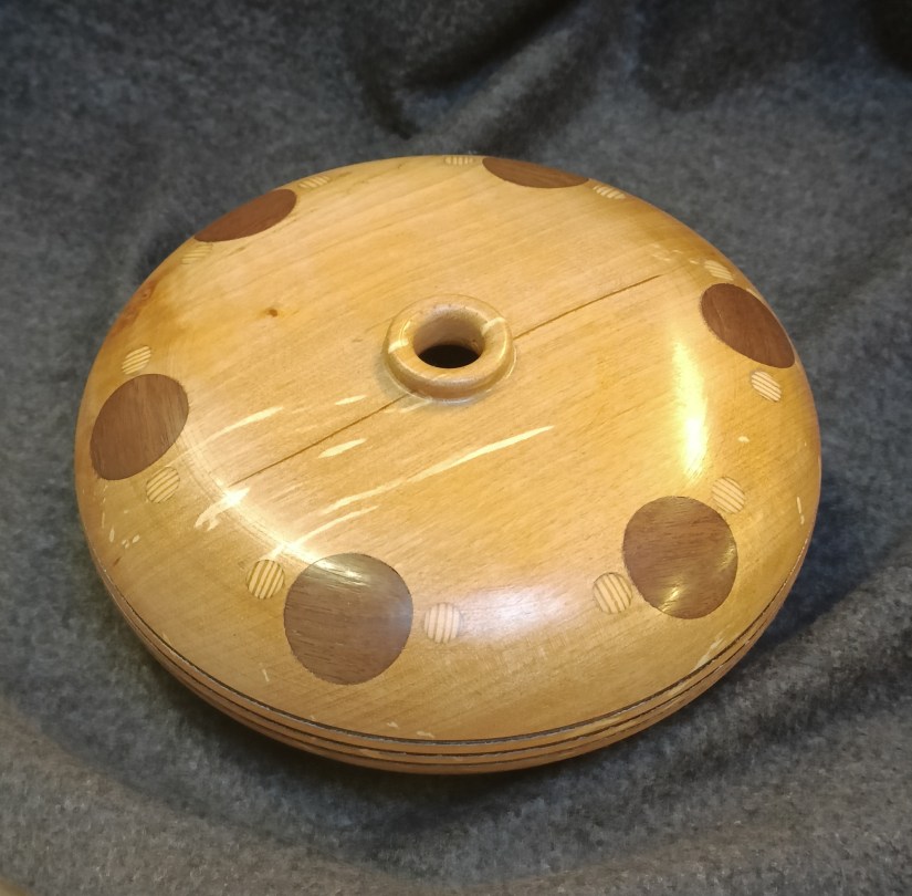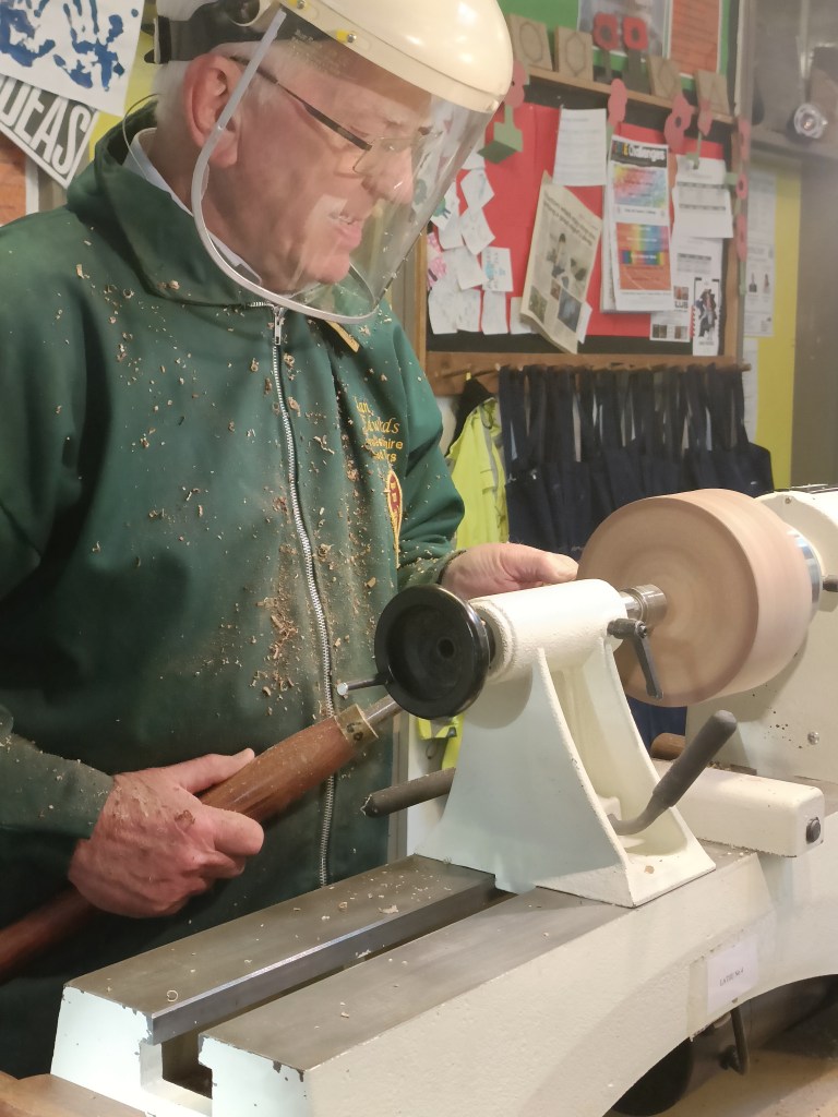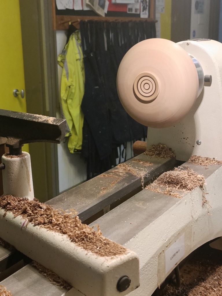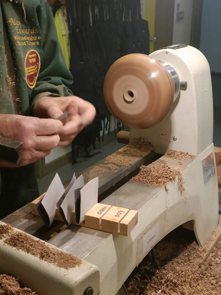 Having roughly shaped the outside Alan then offered us an alternative that he had previously made – the same vessel with circular insets using his home made jig to house the Forstner bit and utilising the lathe’s indexing.