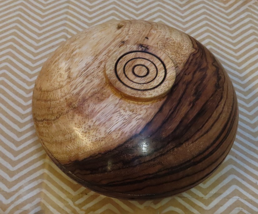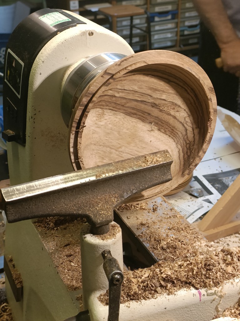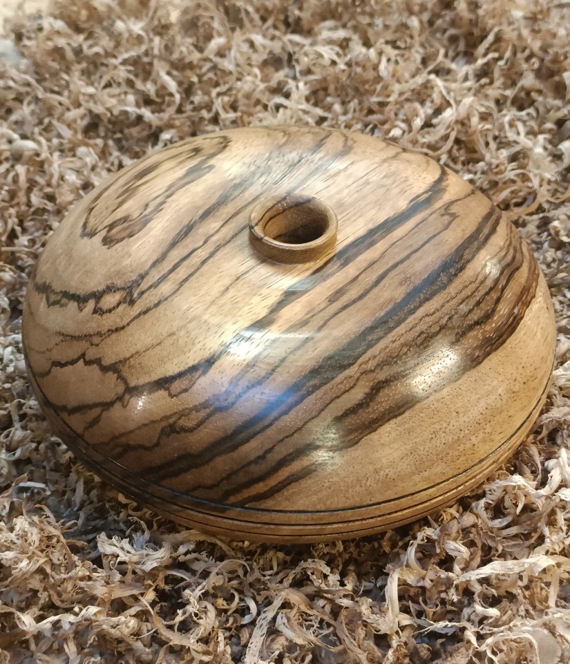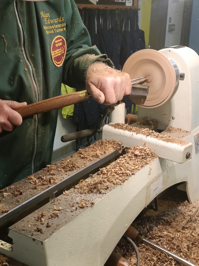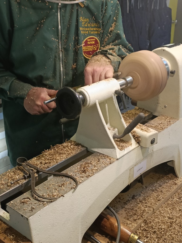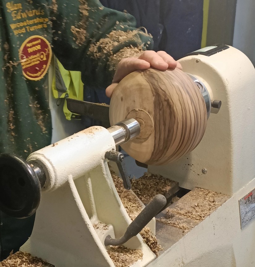 So Alan stepped up with only a few hours notice to undertake this interesting hollowing demo. Using a 3″ Zebrano disk he began by rounding it and putting a spigot on either end – one of which would later serve as the foot.