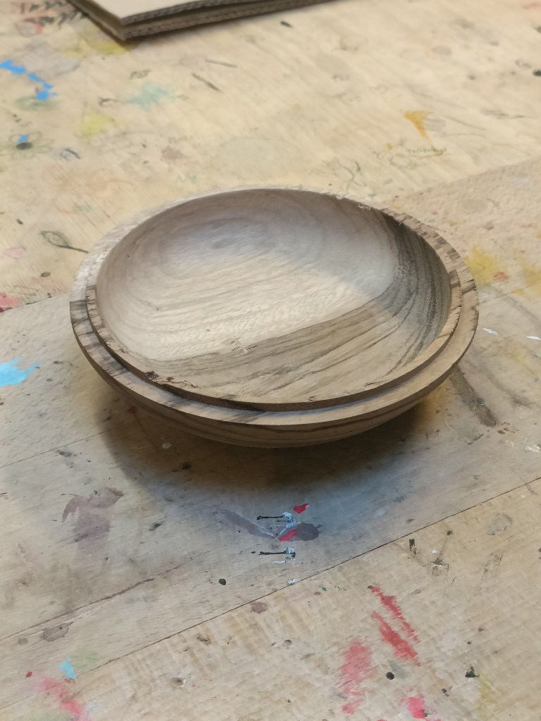Time now to part the vessel in half and hollow leaving a lip in order to rejoin the two halves later. Once glued with Superglue he set about the final shaping including finishing the foot and applying a thinned down coat of melamine (3-2)