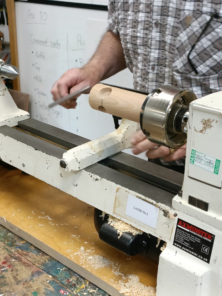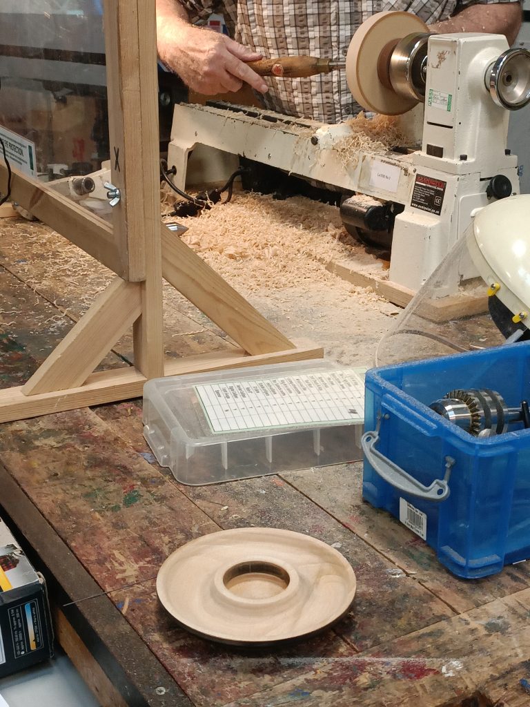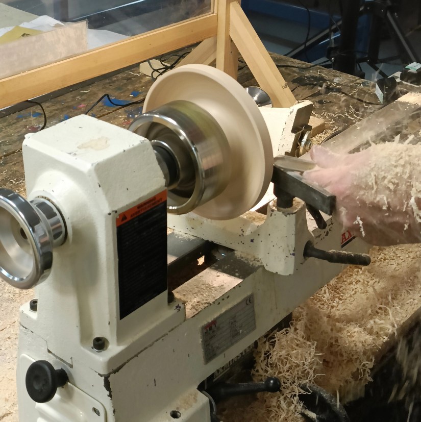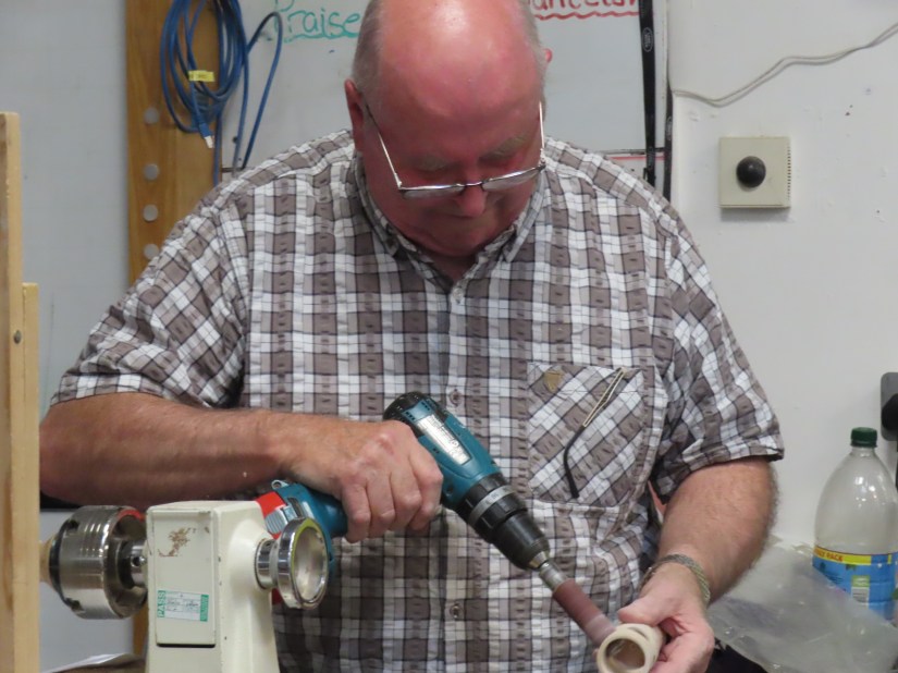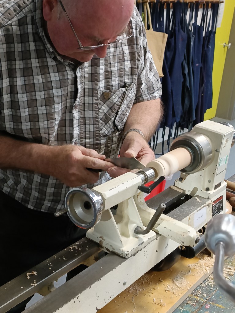 After the break Roy set about turning the toadstool top which would fit on top of the beech spindle already turned.