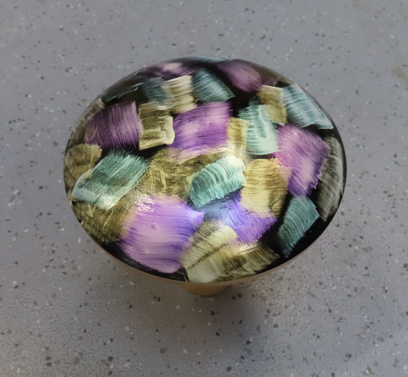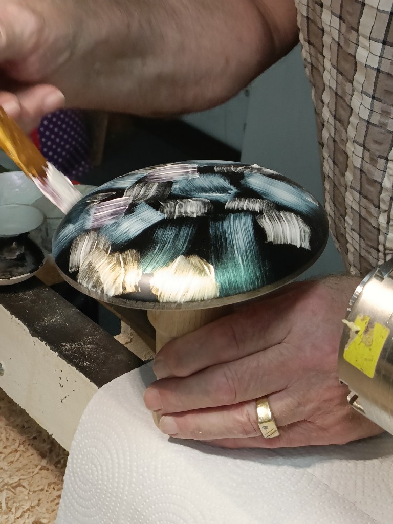 Once made and fitted the top was then sprayed with a base layer of black eboniser before applying the irridescent paints with a brush. A very interesting project and a proven seller at craft fairs. Well done Roy.