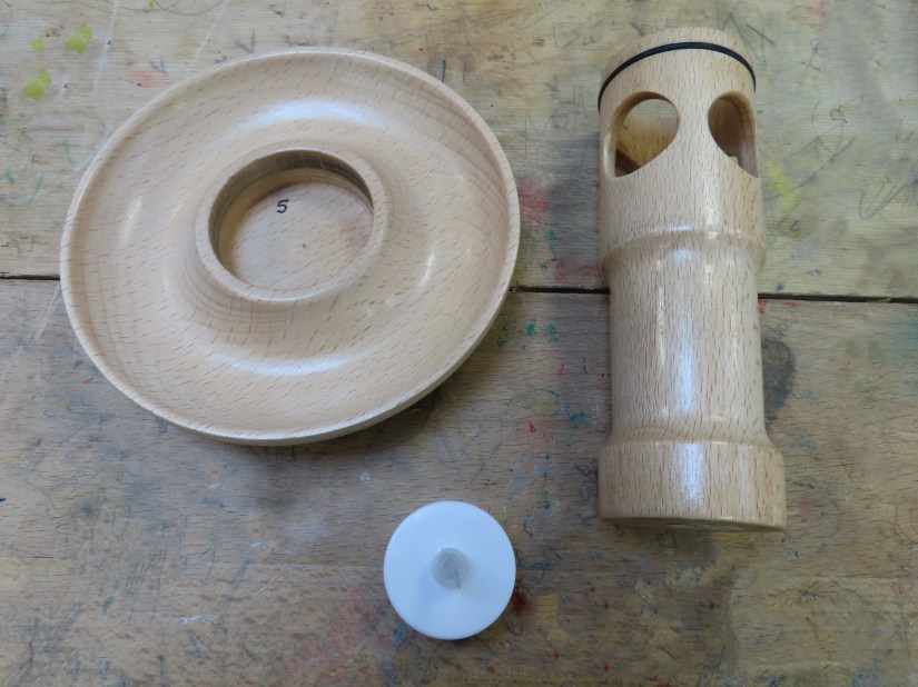 Roy began his project by drilling 4 holes in the side of a beech spindle (part of a Dunelm rolling pin!). He then made a channel to accept a rubber O ring with his narrow parting tool. This would seat the toolstool top securely in the completed item. This section of the demo was completed by shaping the spindle and drilling a central hole with a Forstner bit mounted in his Jacob’s chuck to expose the 4 holes and seat the LED tealight.