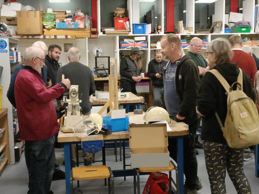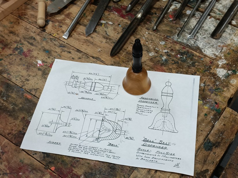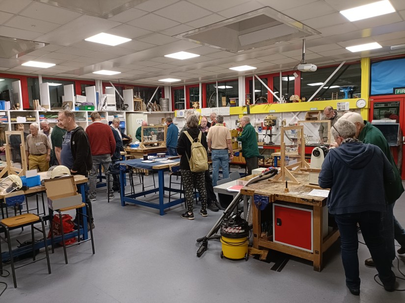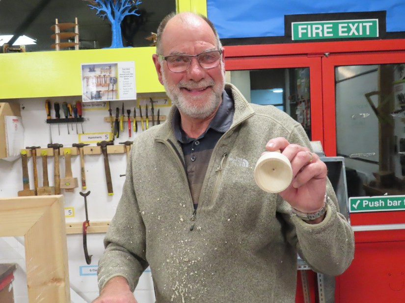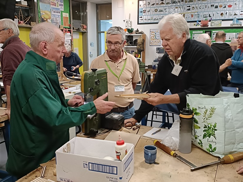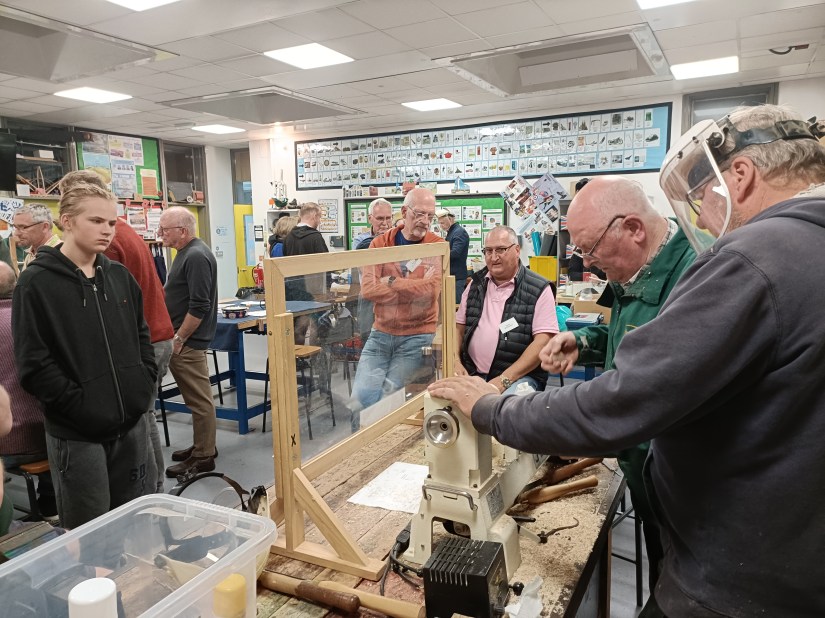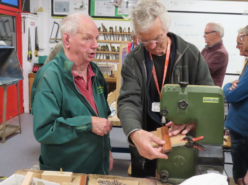 It was great to see so many new faces at tonight’s Hands On session with a choice of five set ups on offer. The two Alans (Edwards and Pattison) mentored a number of new members to make light pulls. Phil’s student attempted a simplified version of Alan E’s Bell Salt Shaker while Roy tried out the full project – ambitious in the time he had. An added bonus for the evening was Keith’s demo on how to produce the segmented pens he featured on our last Show and Tell evening. A rare chance to watch the master at work!