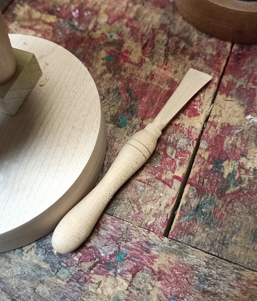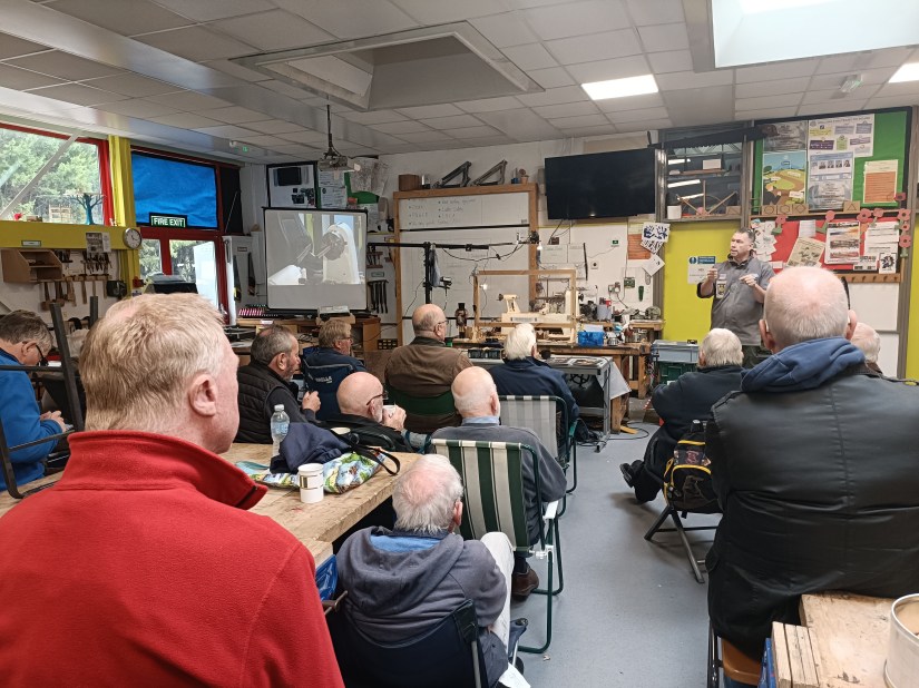 Renowned teacher and turner Colwin Way began his demo by introducing us to the skew chisel – the way he began as a 17 year old apprentice. It turned out to be a masterclass in the use of this tool. After the technique the practice. Colwin made us a lace bobbin which he used to make by the thousands and, given the impending season, a Xmas tree, both with the skew chisel.