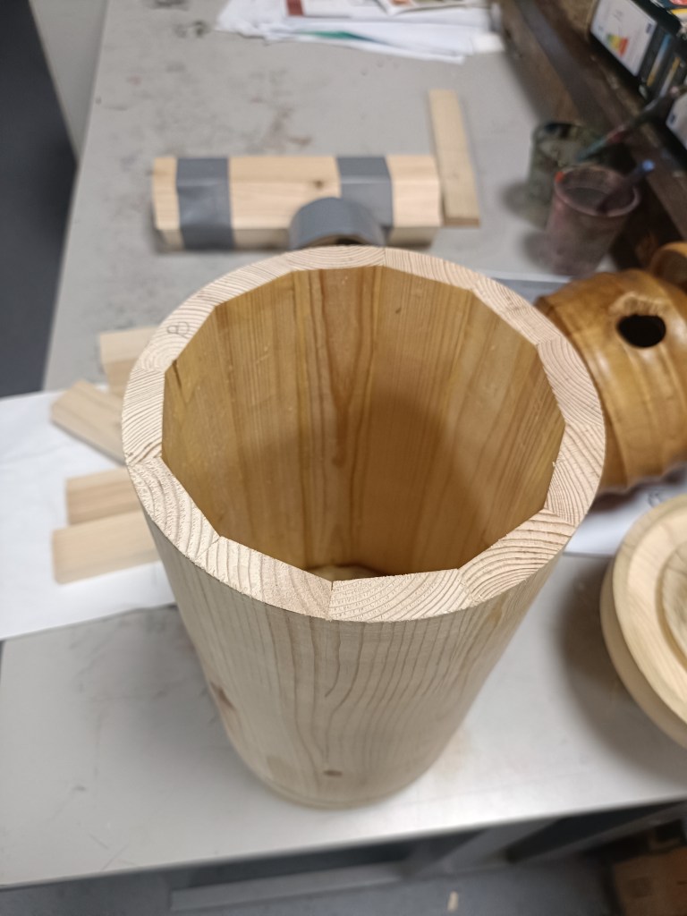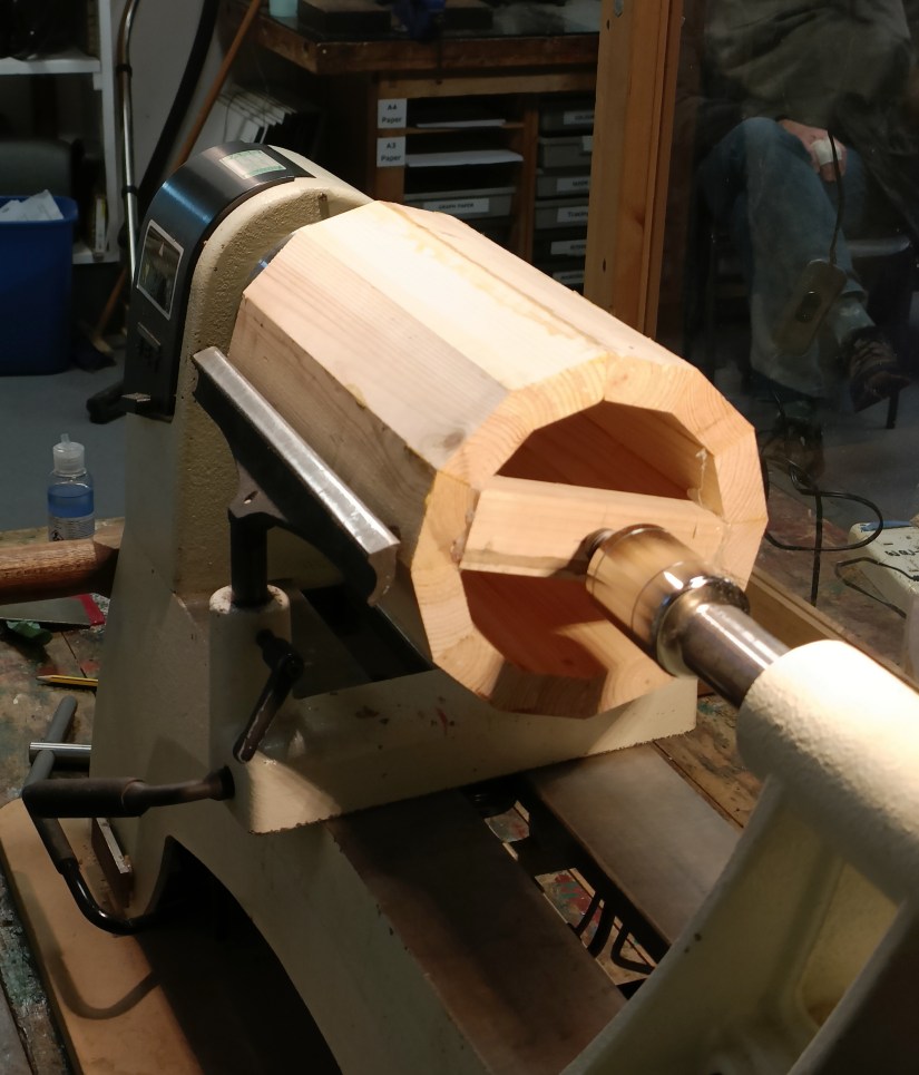After some initial problems mounting his pre – prepared bird box body onto the lathe Robin set about turning the segmented tube to round – initially with a skew and later using the spindle roughing gouge.
