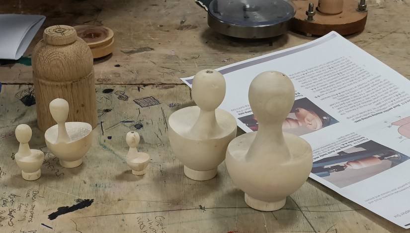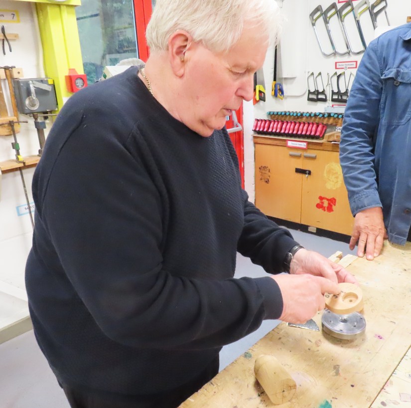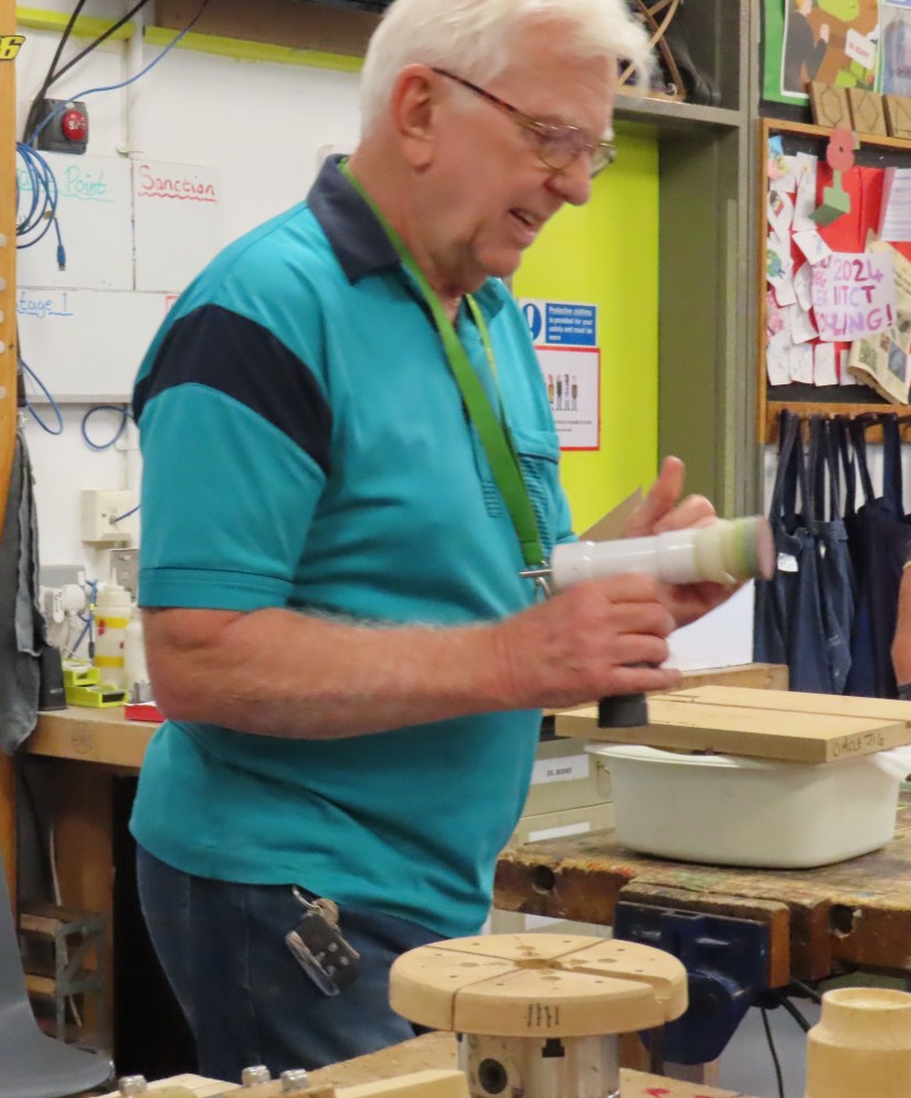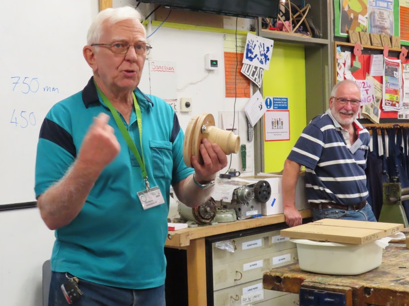 Alan E returned to the floor to show us jigs for bandsaw work, a spindle steady and a jig for turning pendants with off centre holes.