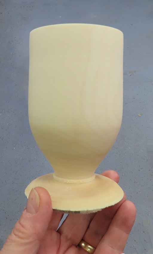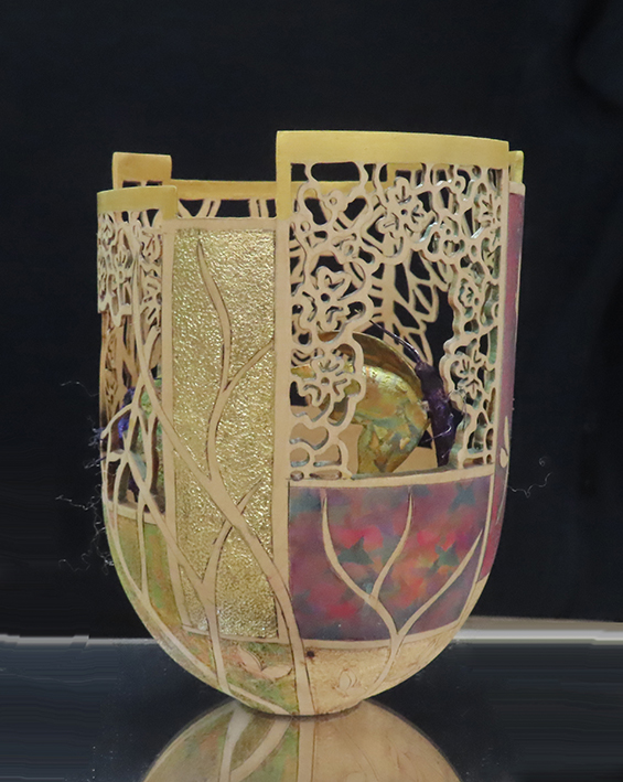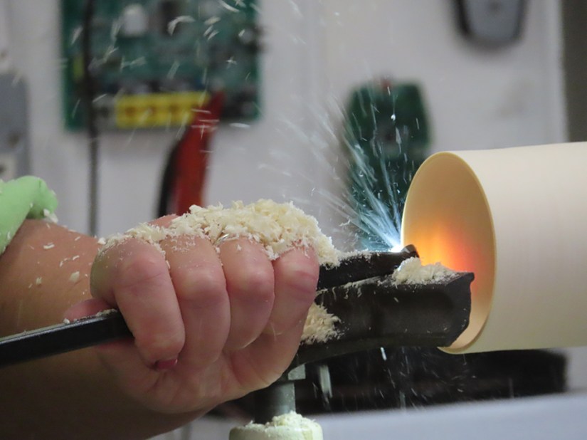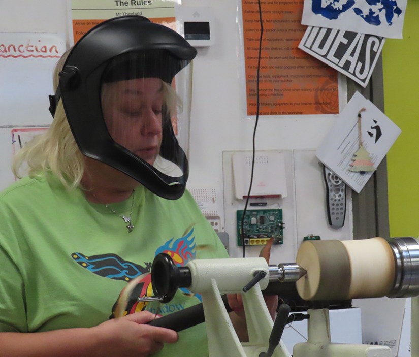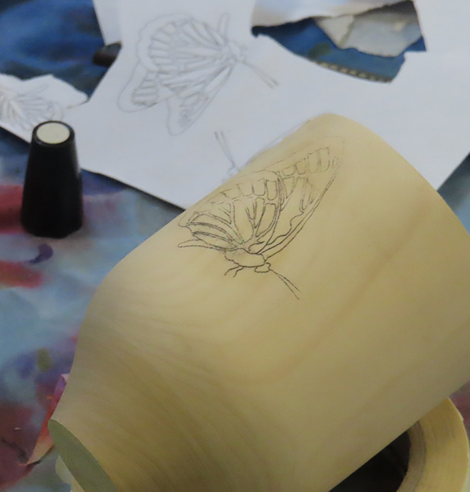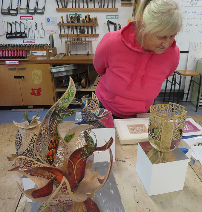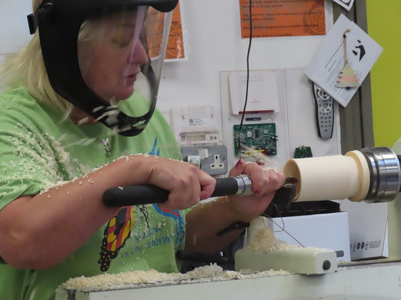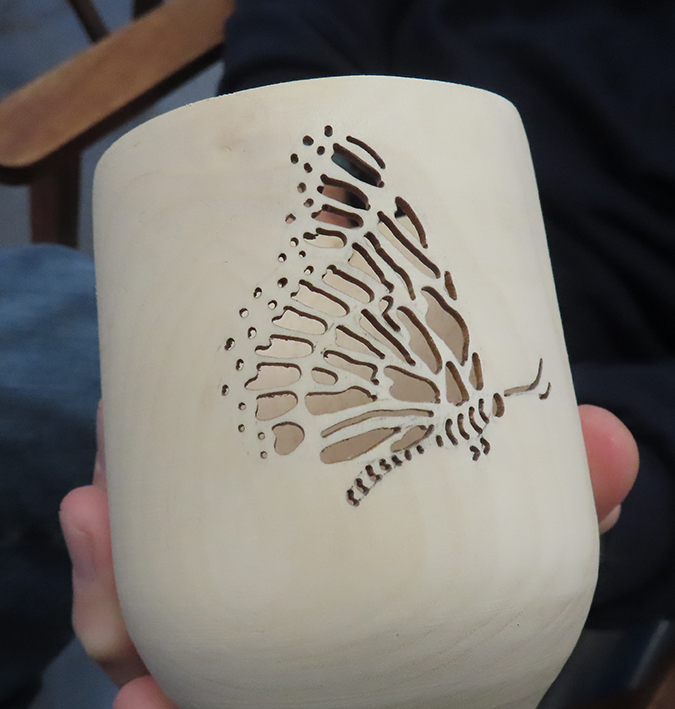 She split the day into 3 sections – woodturning, carving and piercing and finally decorating. Firstly she turned and hollowed a piece of green sycamore (her preferred wood) using only a bowl gouge and carbide cutter. Lamps were used inside and outside the wood to achieve the thin walls that she needed.