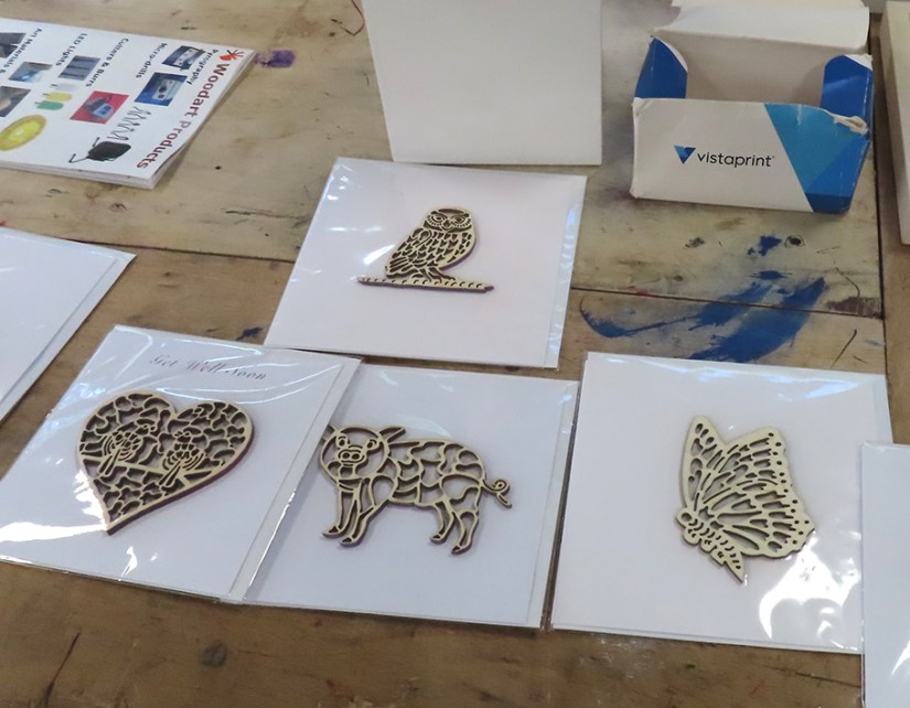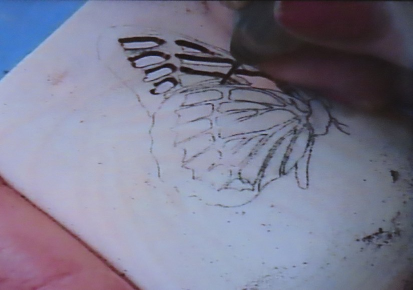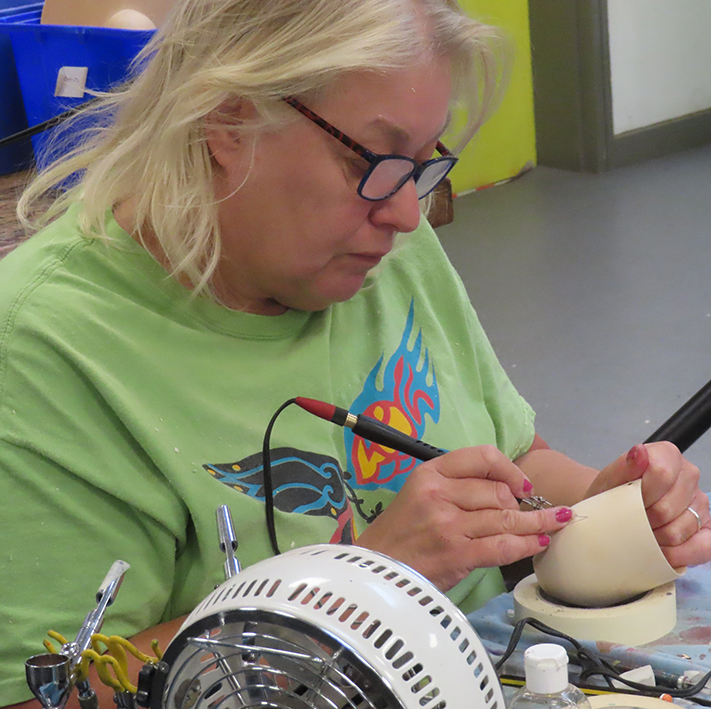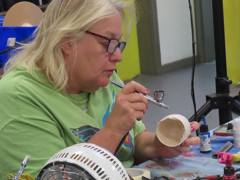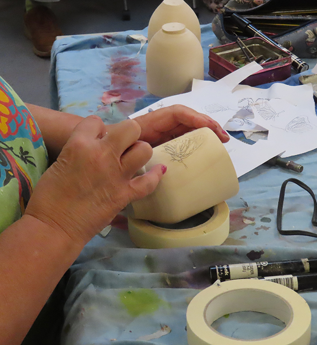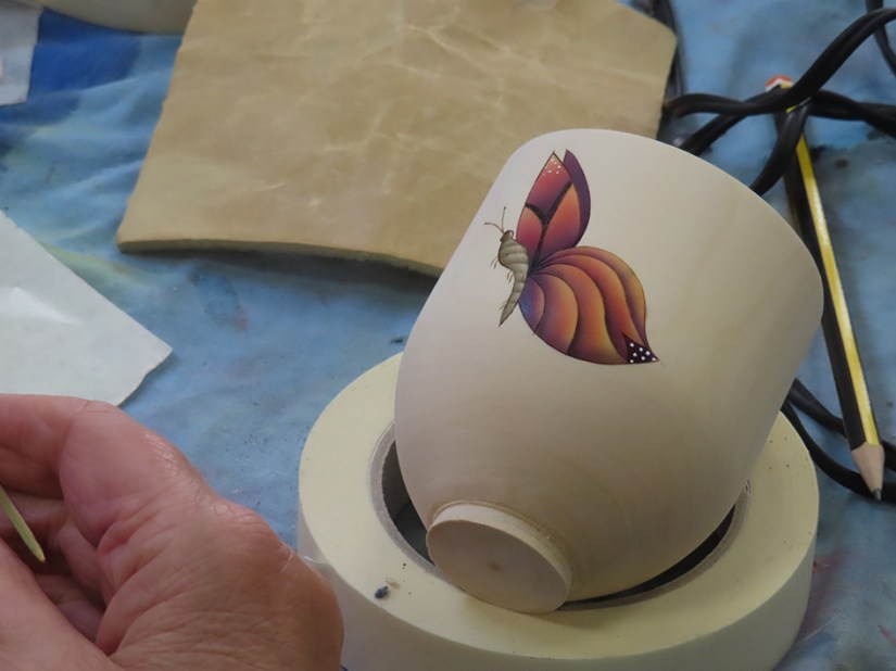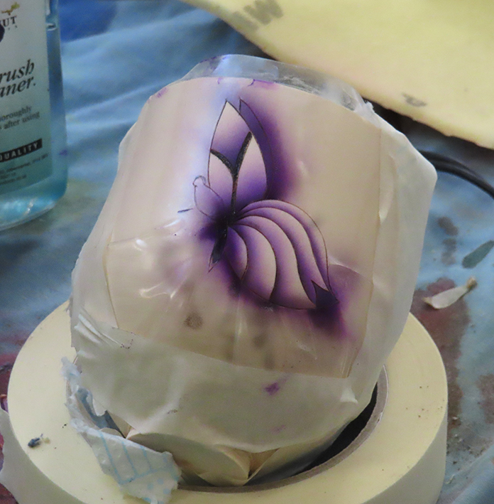 After lunch we moved onto, what I suspect, is Joey’s favourite part of her work – the decoration. We were taken through a magical mystery tour of stencil making, masking, pyrography and airbrushing in layers which she applied to a number of examples.