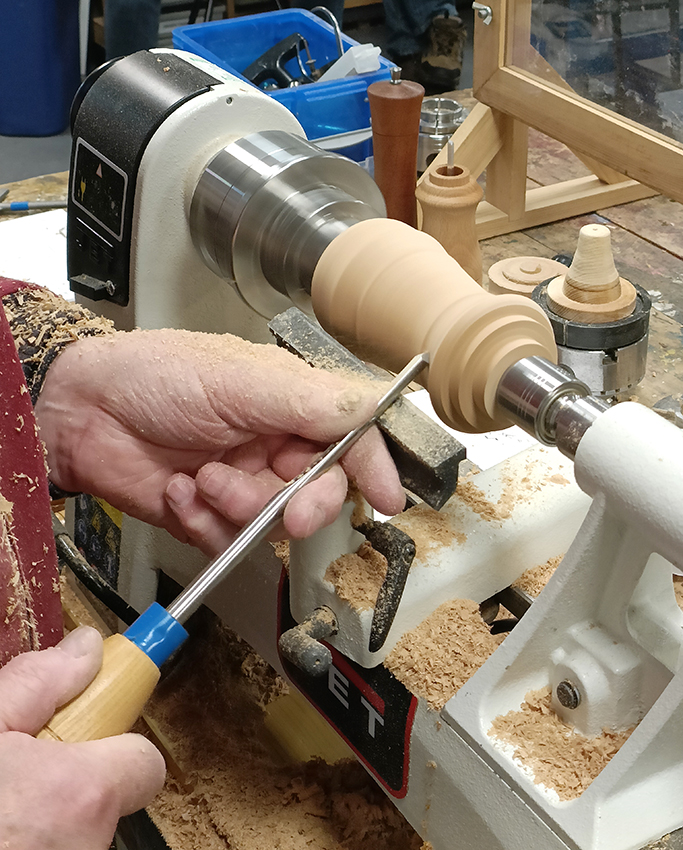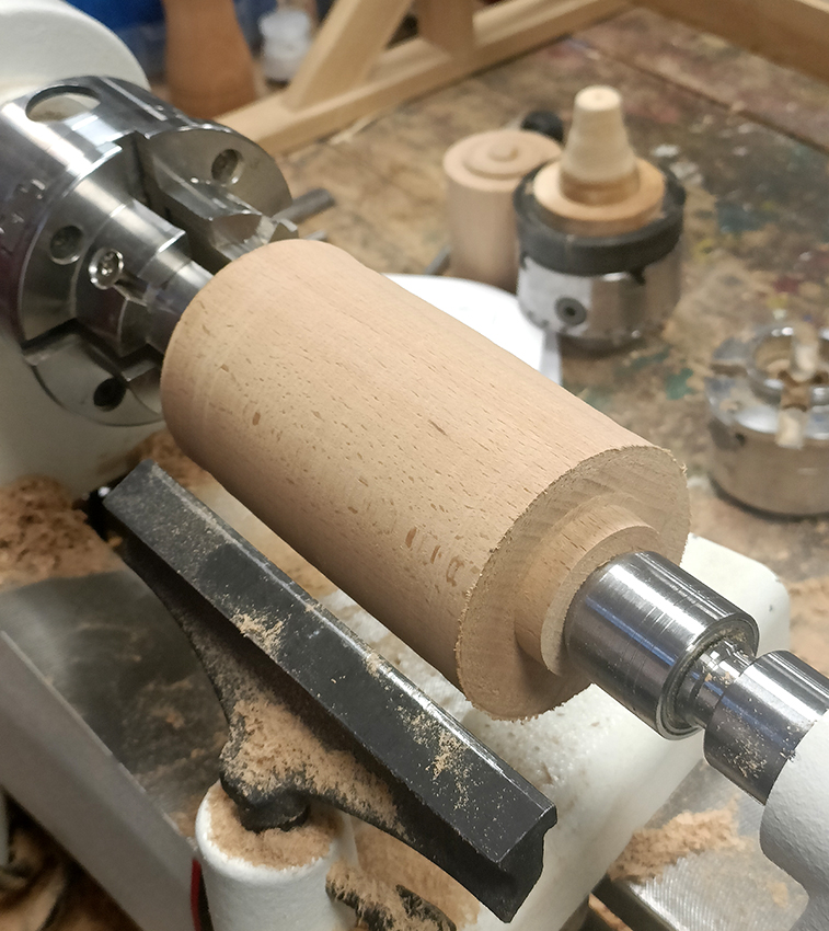 Starting with a 70×70 beech blank Alan first took it to round with his roughing gouge and followed this by making his tenons and parting off to suit the dimensions of his grinding kit (Prokraft).