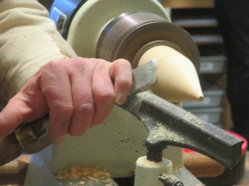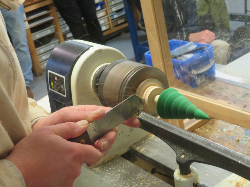 He began by rounding a lime spindle with the roughing gauge before parting off to begin his Xmas tree and demonstrate the techniques involved.