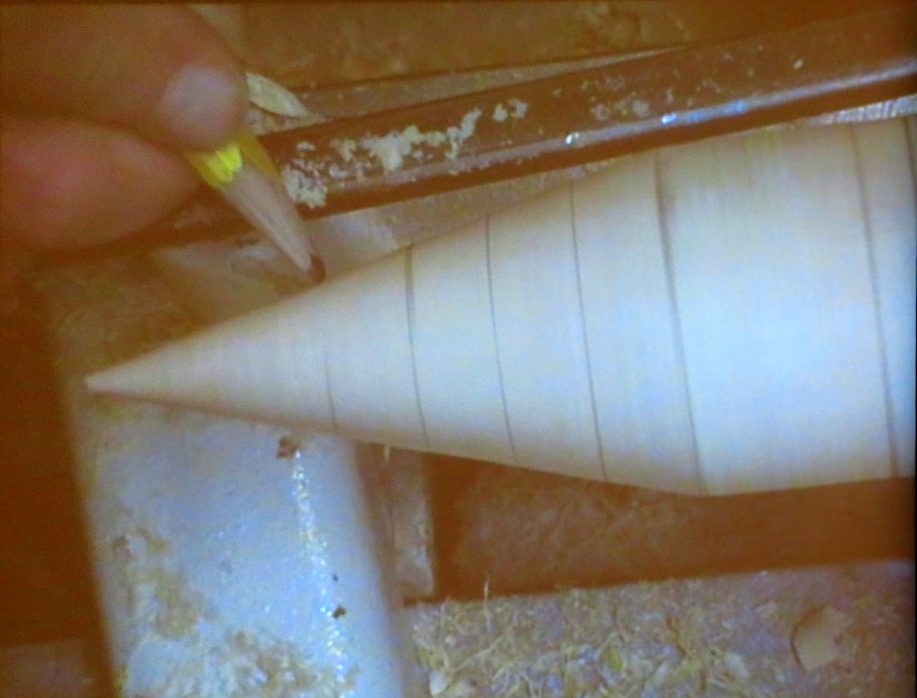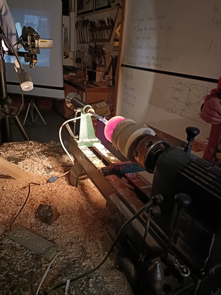 Now satisfied with his finish after sanding he then inserted his homemade lighting rig (mounted into the tailstock) into the cavity. By the transluscency of the wood as he turned away material he could gauge the wall thickness as he shaped the outside of the piece.