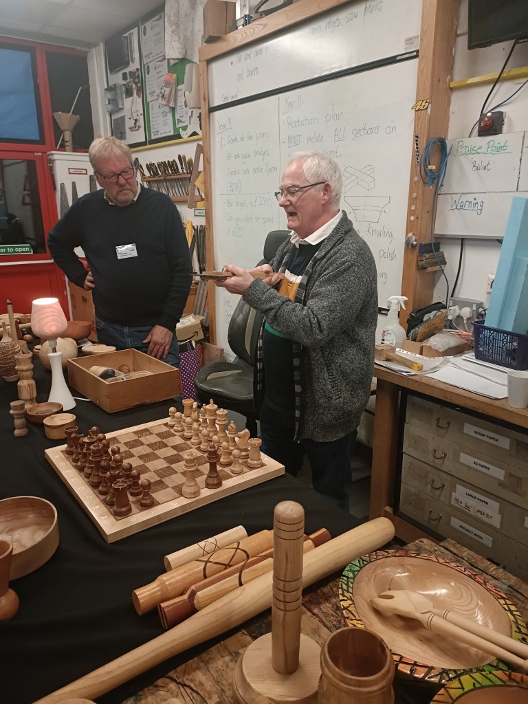 Next an impressive contribution from Eugene – a competition standard chess set that he had made as his first turning project (putting many of us to shame with the quality of it!!). He had even designed and built his own tools to ensure uniformity of the pieces. Well done Eugene!
