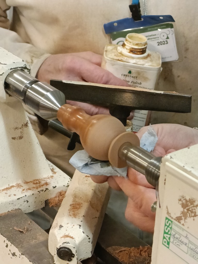 After the break Roy re – mounted the piece between home – made plastic lugs in order to protect the lathe from the Superglue. He then proceeded to show us his method of applying 7 thin coats of Superglue, based on his long experience of making pens, and his finishing routines.