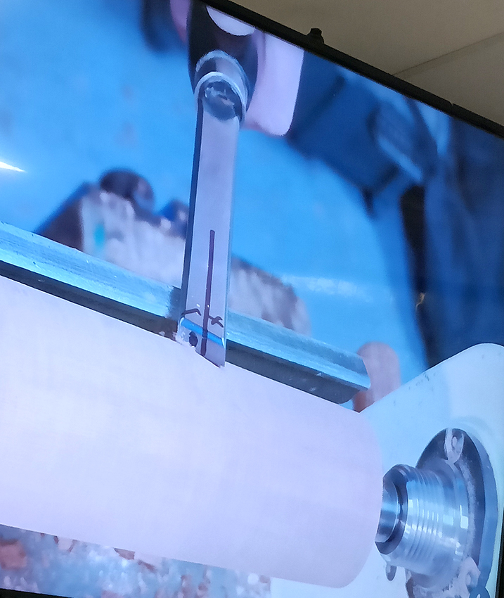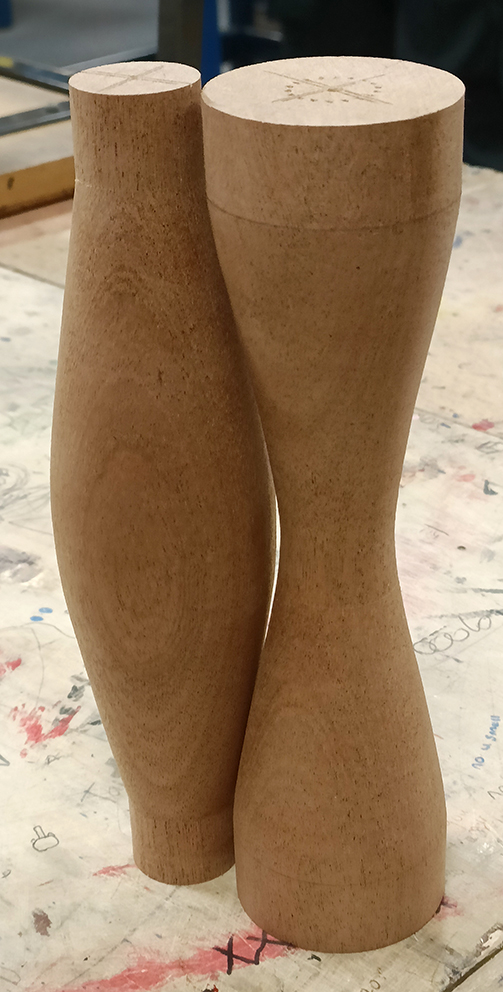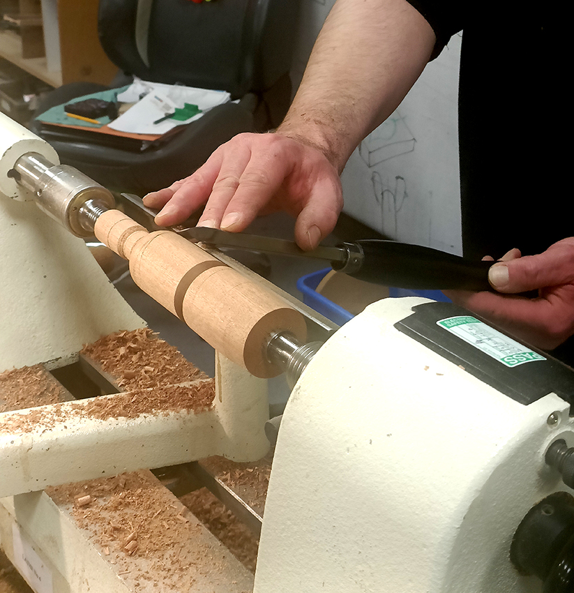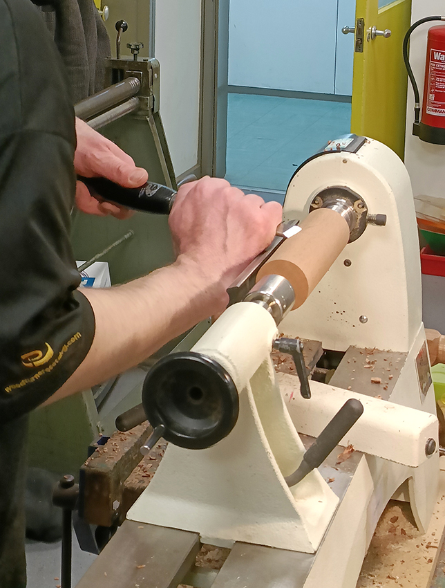 Starting with a 70×70 beech blank Alan first took it to round with his roughing gouge and followed this by making his tenons and parting off to suit the dimensions of his grinding kit (Prokraft).