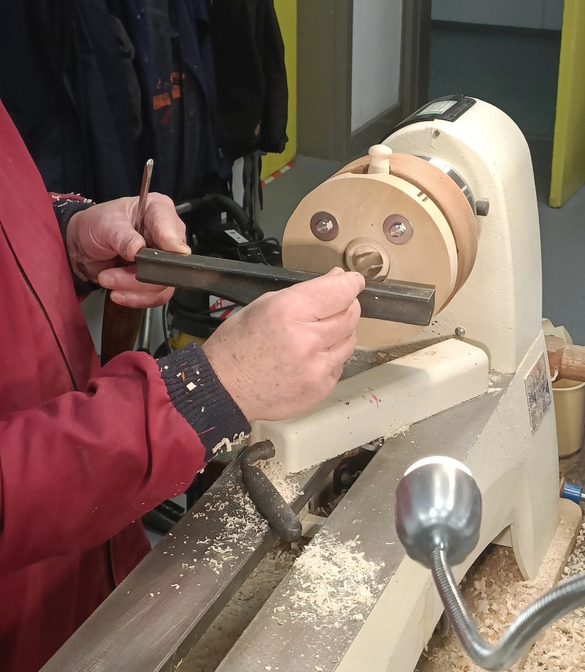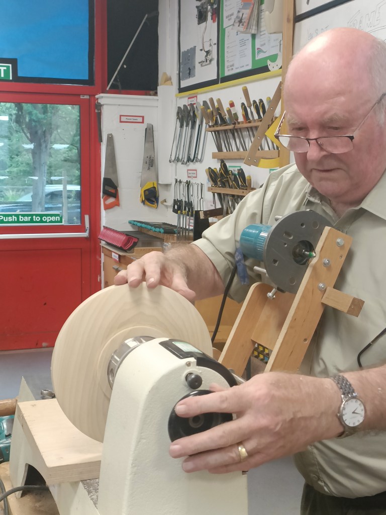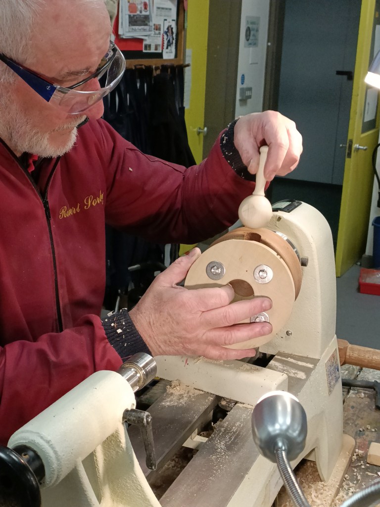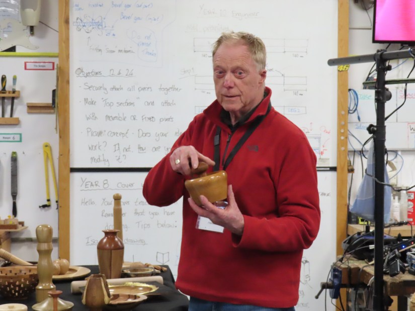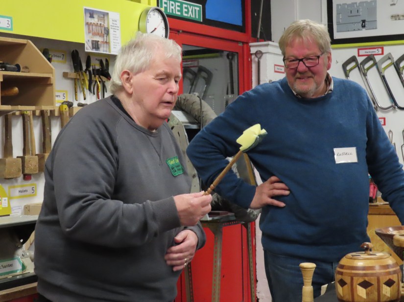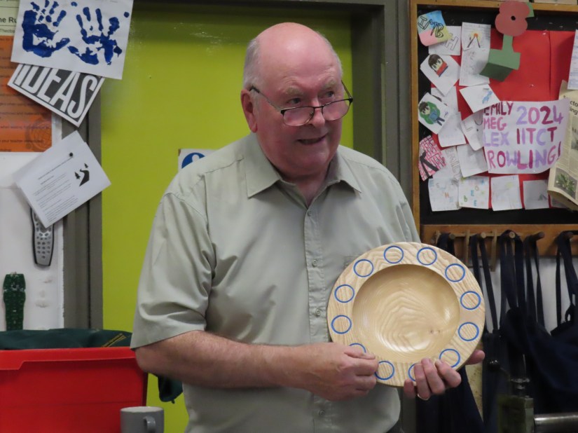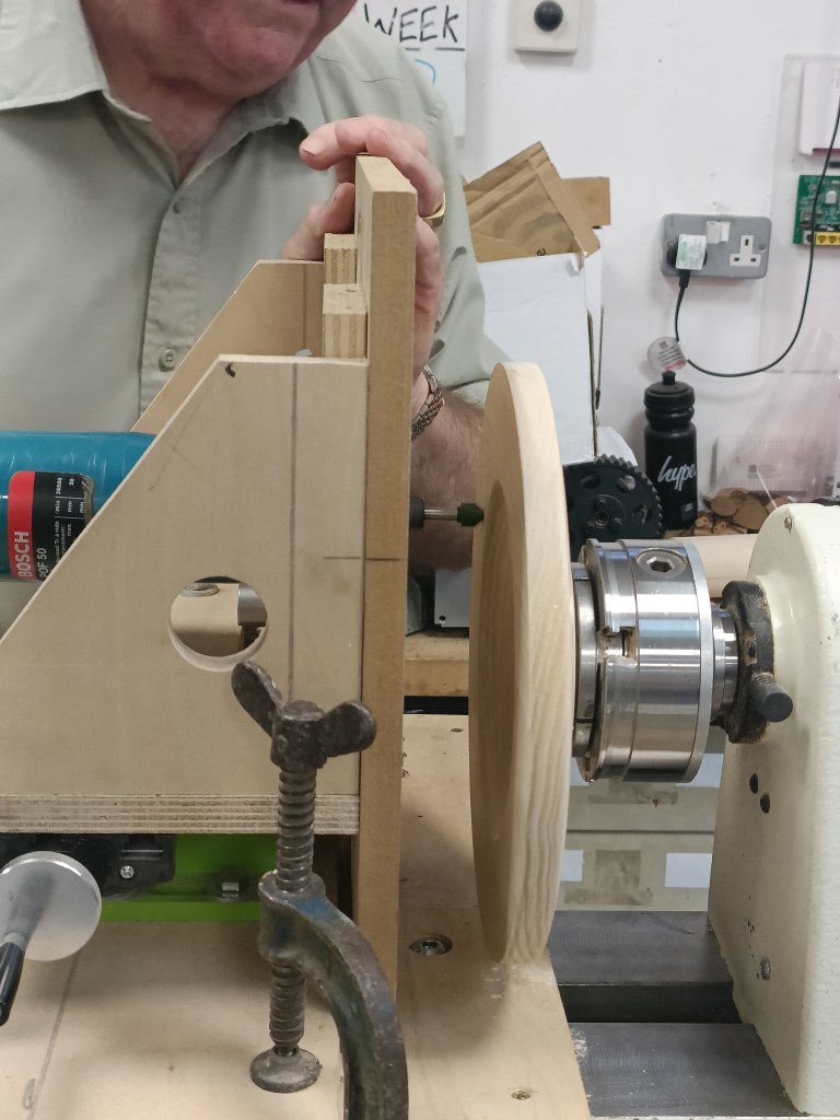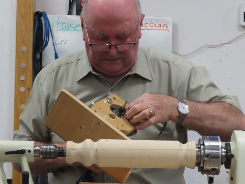 Alan E returned to the floor to show us jigs for bandsaw work, a spindle steady and a jig for turning pendants with off centre holes.