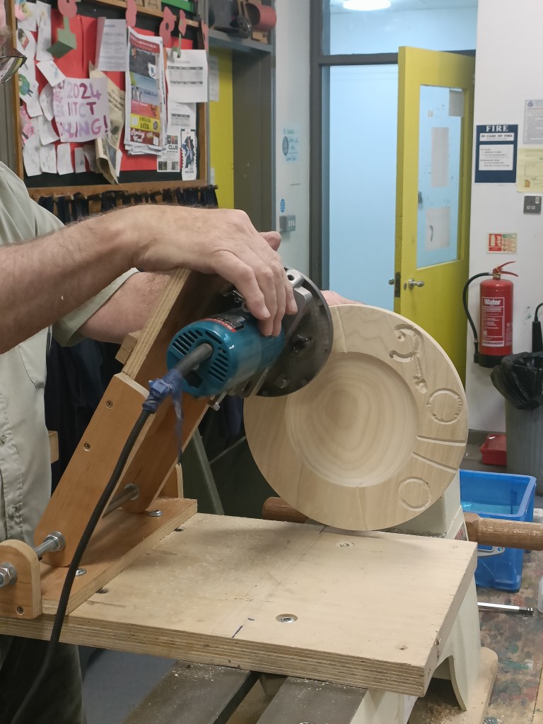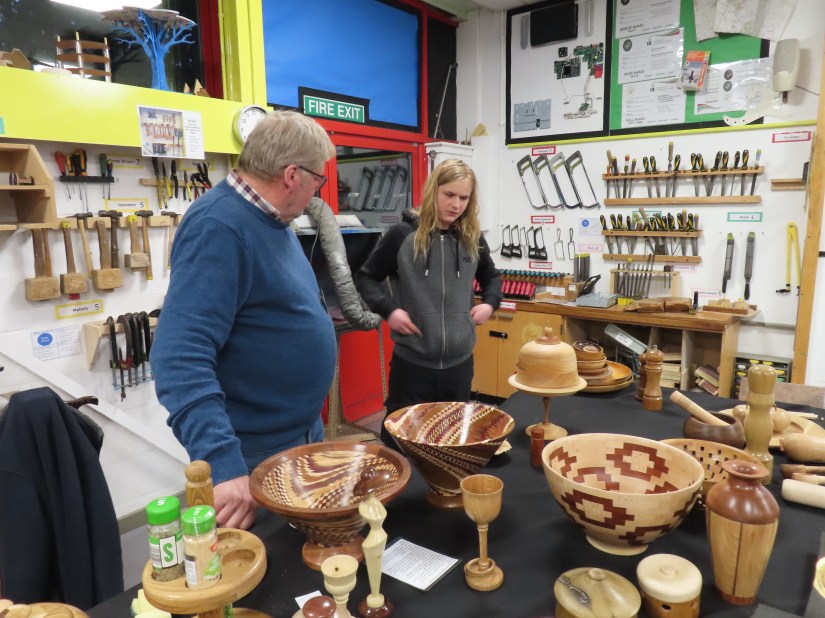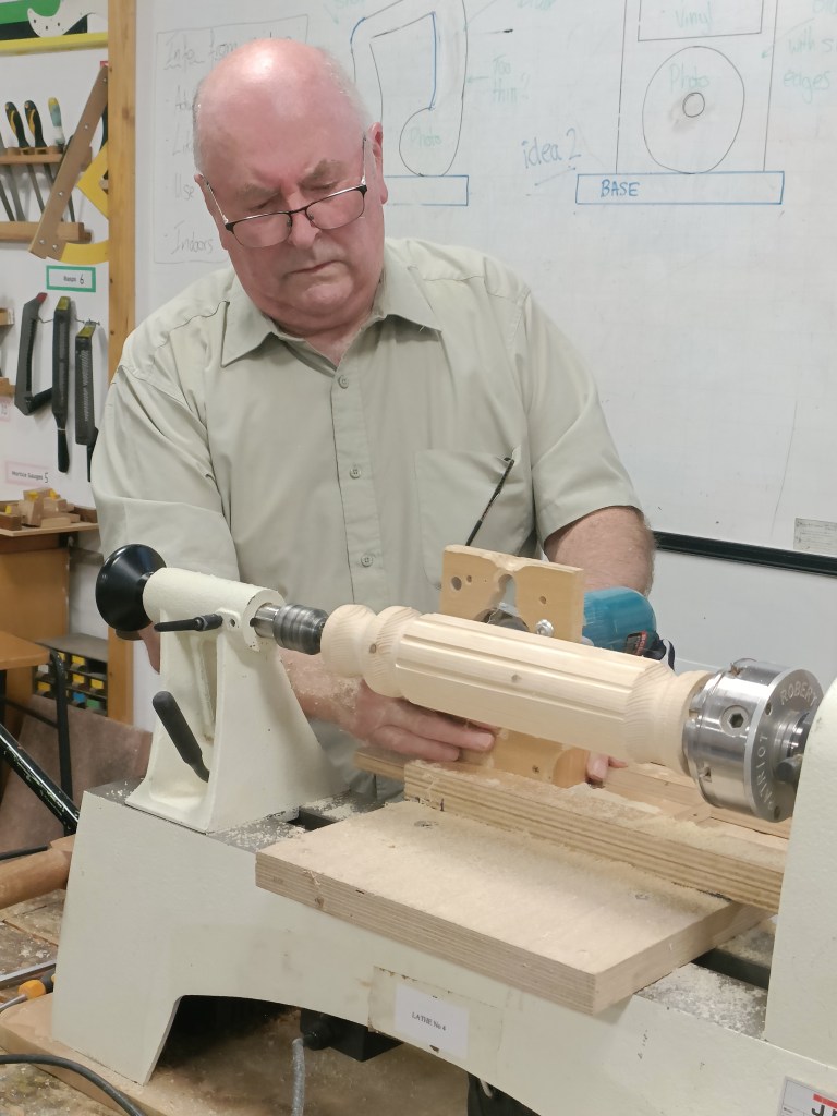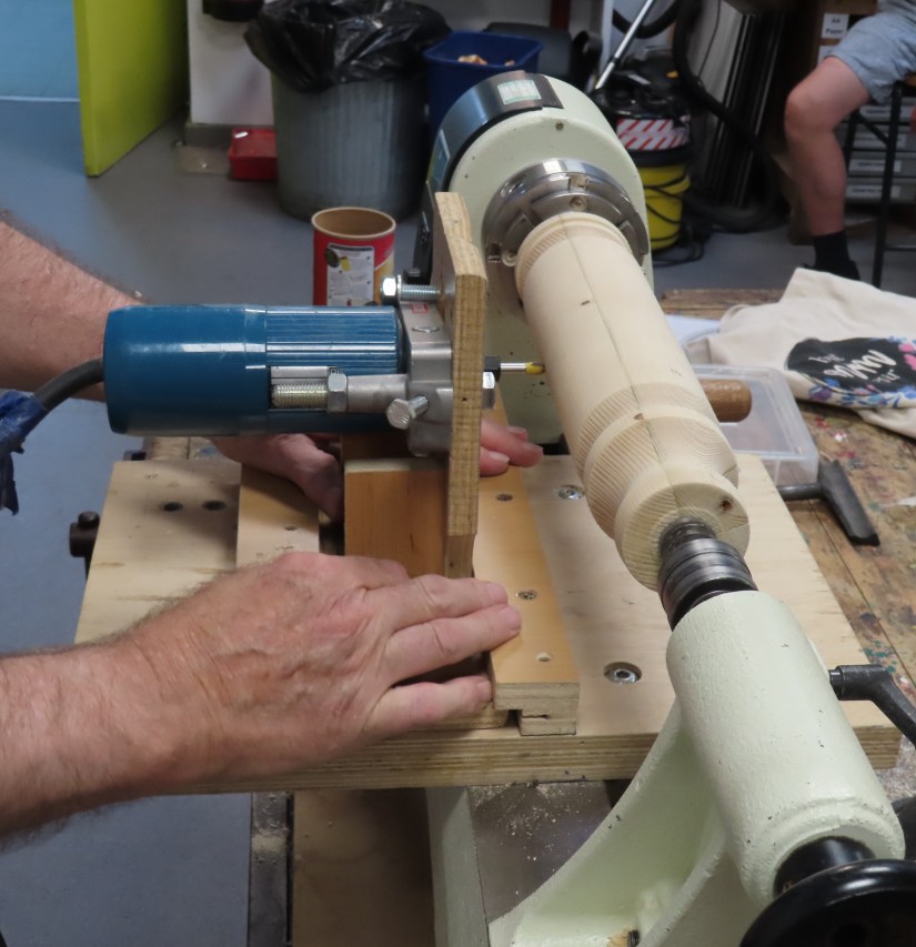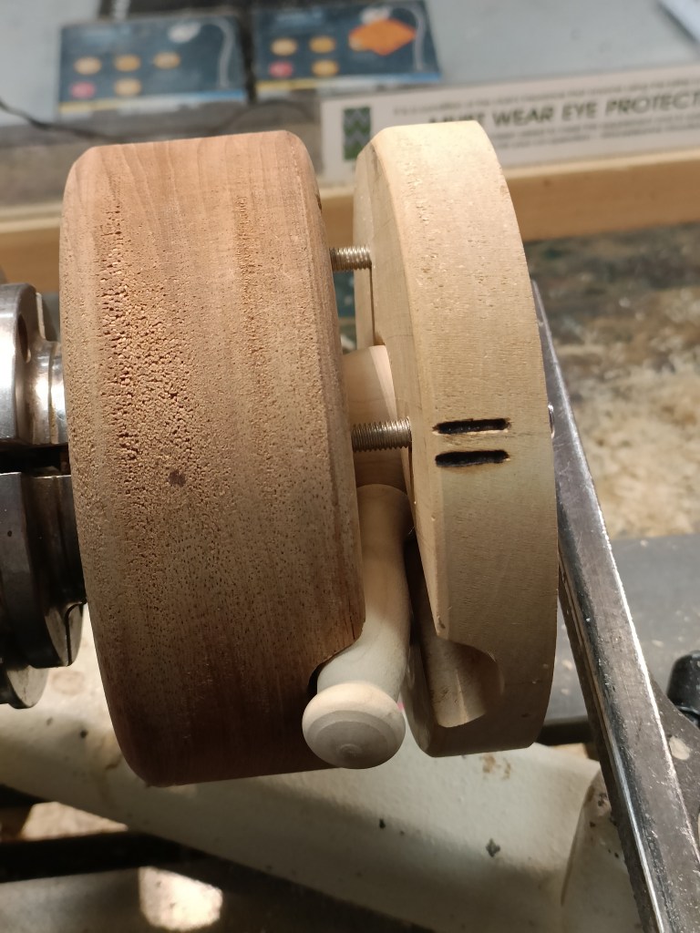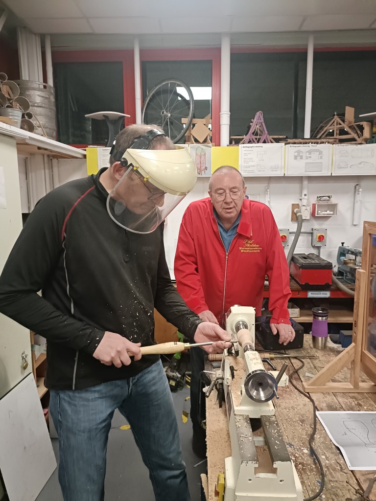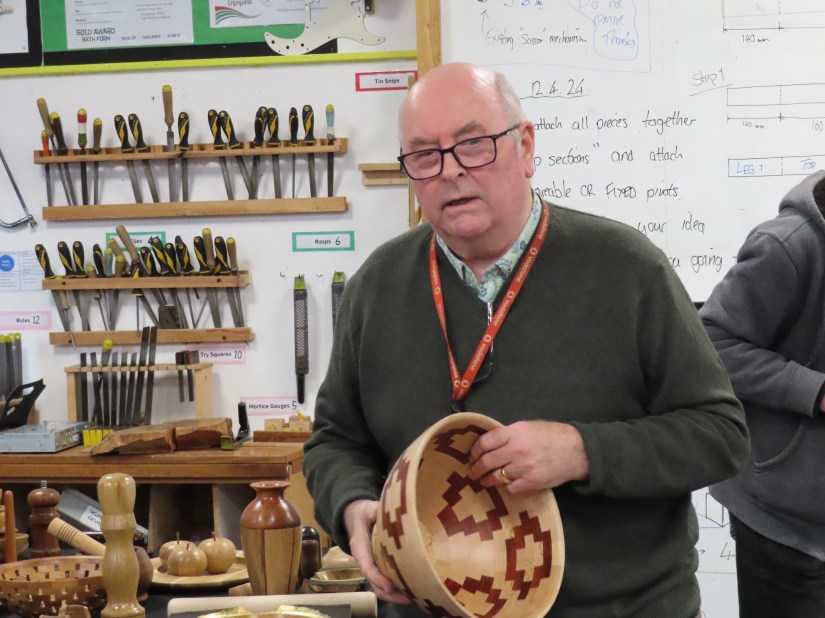 Alan E returned to the floor to show us jigs for bandsaw work, a spindle steady and a jig for turning pendants with off centre holes.